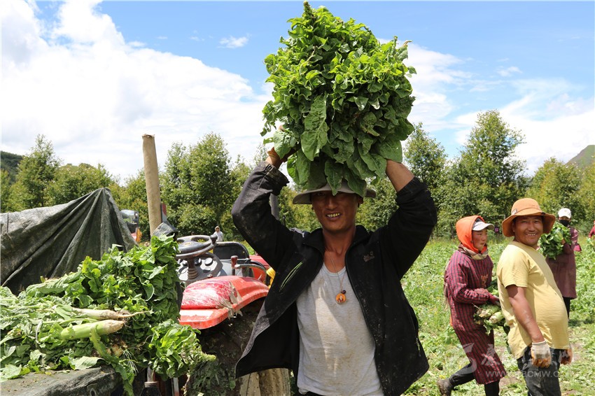 去年5月,記者站在海拔3600米的蘿卜種植基地,天空正飄著細(xì)雨,舉目是云霧繚繞的雪山,雨水滴落在四千多畝青綠色的蘿卜地上,白蘿卜已從土里探出頭來,似乎在等待采收。一股清甜的蘿卜味,伴隨著雨地里收割者的嬉笑聲,撲面而來。