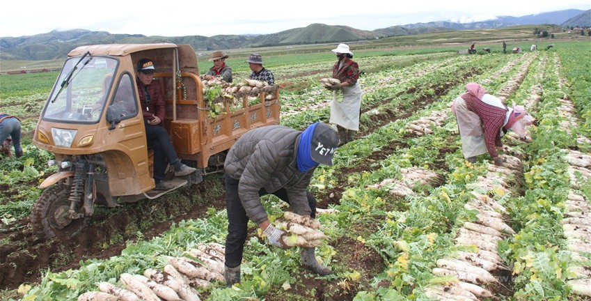 一根根白蘿卜,從理塘縣的沙礫地里,被農(nóng)牧民拔出來,被迅速清洗、包裝,及時裝上排隊等候的冷鏈車。過雅江,翻折多山、二郎山,在雪域高原行駛四百公里后,抵達(dá)川西平原,再上成渝環(huán)線高速,后經(jīng)廈蓉高速,抵達(dá)珠海、深圳,進(jìn)入香港、澳門市場。