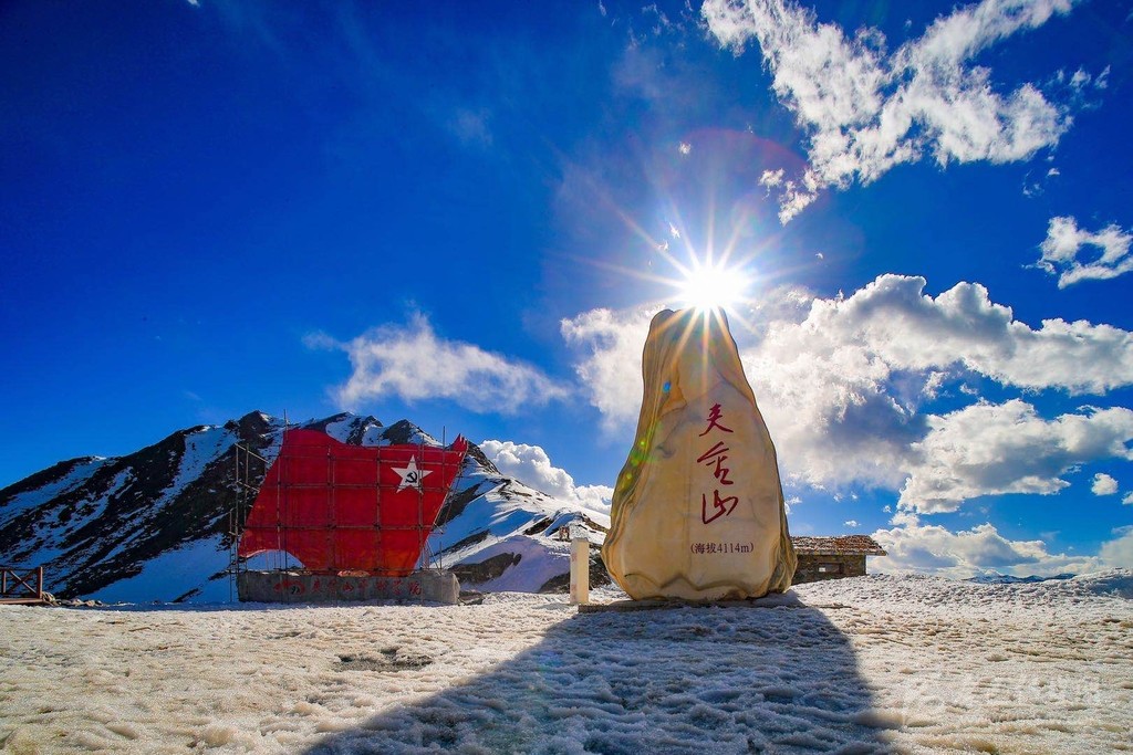 夾金山埡口海拔4114米,山頂終年積雪。美國著名記者索爾茲伯里重走長征路后,在《長征,前所未聞的故事》中曾這樣描寫夾金山:“從山上極目遠眺,地平線上雪峰兀立,與加拿大的洛基山脈一樣巍峨。頂峰在樹線之上,高聳入云。后來修的公路呈之字形盤旋而上。在這里,所有的綠色都不見了。山成了光禿禿的一片褐黃,不久便是雪的世界。即使在五六月間,也還是厚厚的積雪,一直鋪到峰頂,鋪到雪山的另一邊。”