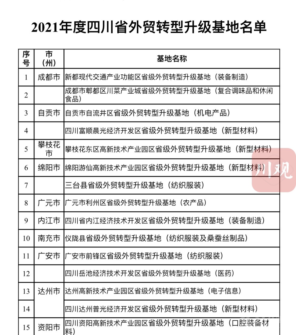 建設(shè)外貿(mào)轉(zhuǎn)型升級(jí)基地是穩(wěn)定和暢通外貿(mào)產(chǎn)業(yè)鏈、供應(yīng)鏈、推進(jìn)貿(mào)易高質(zhì)量發(fā)展的重要舉措。2020年,商務(wù)廳等省級(jí)9部門印發(fā)了《關(guān)于加快推進(jìn)四川省外貿(mào)轉(zhuǎn)型升級(jí)基地建設(shè)的實(shí)施意見(2020—2025年)》,計(jì)劃用5年時(shí)間,在全省培育外貿(mào)基地40個(gè)。2020年,首批15個(gè)基地率先亮相。