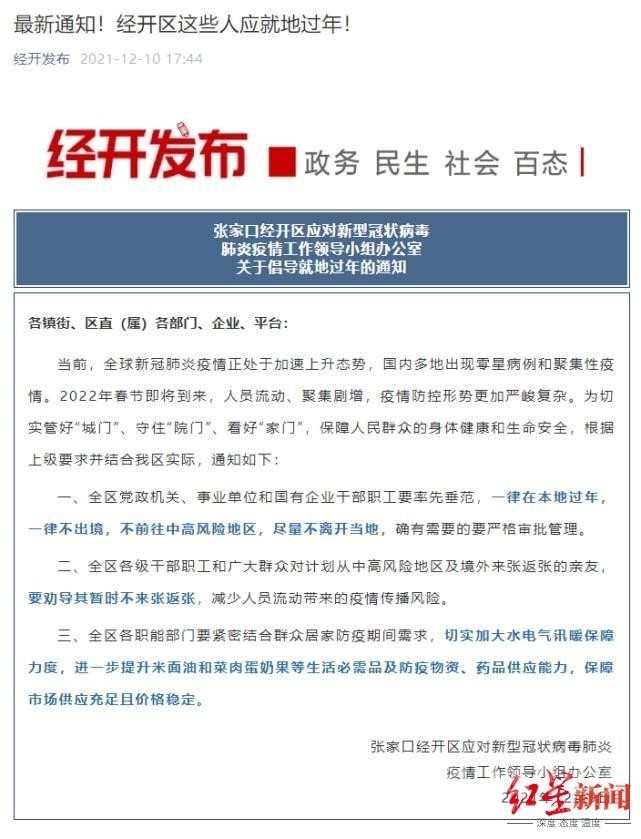 12月9日,河北張家口經(jīng)開區(qū)也發(fā)出通知:全區(qū)黨政機關(guān)職工等就地過年。通知中倡導(dǎo):全區(qū)黨政機關(guān)、事業(yè)單位和國有企業(yè)干部職工要率先垂范,一律在本地過年,一律不出境,不前往中高風(fēng)險地區(qū),盡量不離開當(dāng)?shù)?,確有需要的要嚴(yán)格審批管理。
