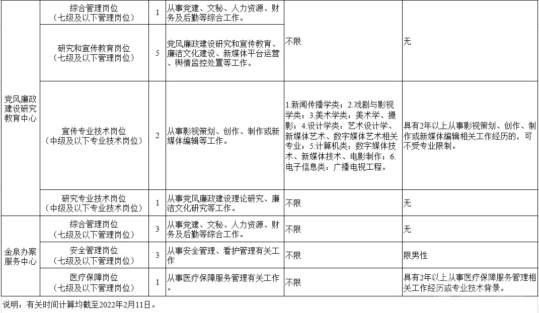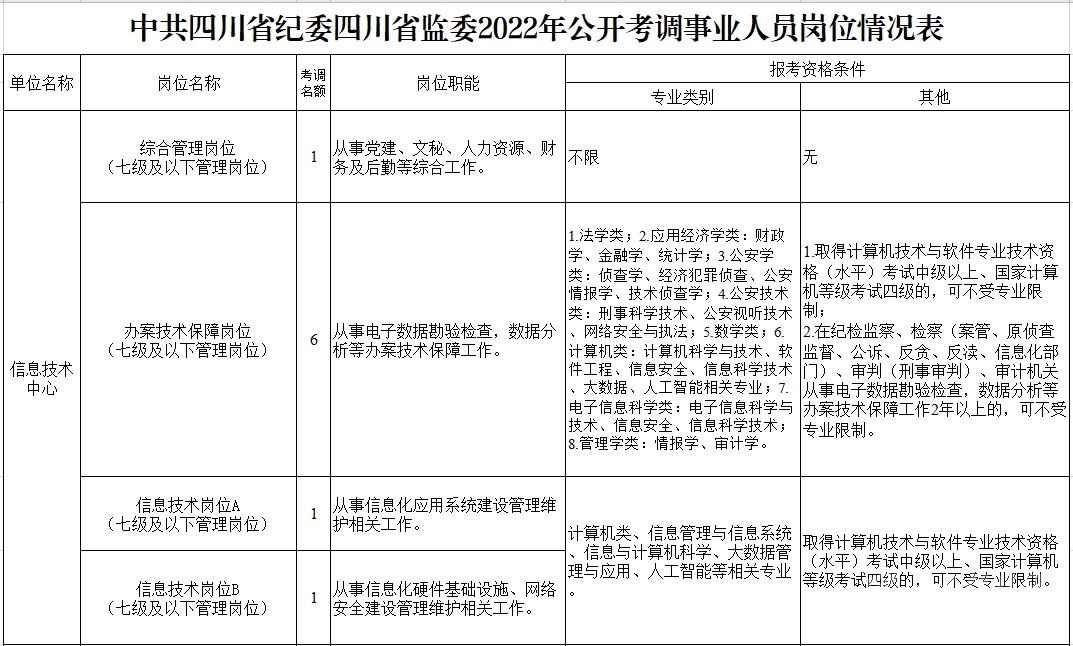 考調(diào)名額 考調(diào)事業(yè)人員25名。其中,信息技術(shù)中心管理崗位9名,黨風(fēng)廉政建設(shè)研究教育中心管理崗位6名、專業(yè)技術(shù)崗位3名,金泉辦案服務(wù)中心管理崗位7名。 考調(diào)對(duì)象及條件 考調(diào)對(duì)象 全省范圍內(nèi)行政單位或參公事業(yè)單位一級(jí)主任科員(含)以下職級(jí)及相當(dāng)職務(wù)層次人員;縣級(jí)及以上公益一類或全額撥款事業(yè)單位管理崗位七級(jí)及以下職員、專業(yè)技術(shù)崗位中級(jí)及以下工作人員。 考調(diào)條件 具有良好的政治素質(zhì)、專業(yè)素養(yǎng),品行端正,實(shí)績(jī)突出,群眾公認(rèn)。 中共黨員。 全日制大學(xué)本科及以上學(xué)歷,并取得相應(yīng)學(xué)士及以上學(xué)位。 年齡35周歲以下(1986年2月11日及以后出生)。 歷年年度考核均為合格(稱職)及以上。 身體心理健康,具有正常履行職責(zé)的身體條件和心理素質(zhì)。 符合報(bào)考崗位規(guī)定的資格條件,詳見(jiàn)《中共四川省紀(jì)委四川省監(jiān)委2022年公開(kāi)考調(diào)事業(yè)人員崗位情況表》(附后)。 符合法律、法規(guī)規(guī)定的其他條件。 有關(guān)時(shí)間計(jì)算均截至2022年2月11日。 具有下列情形之一的,不得報(bào)考: 被依法列為失信聯(lián)合懲戒對(duì)象的。 涉嫌違紀(jì)違法正在接受有關(guān)專門機(jī)關(guān)審查尚未作出結(jié)論的。 受過(guò)黨紀(jì)政務(wù)處分或司法機(jī)關(guān)刑事處罰的。 受到誡勉、組織處理等影響期未滿或期滿影響使用的。 按照有關(guān)規(guī)定,到定向單位工作未滿服務(wù)年限或有其他限制性規(guī)定的。 尚在試用期的。 按照相關(guān)規(guī)定應(yīng)當(dāng)回避的。 法律、法規(guī)規(guī)定的其他情形。 報(bào)名及打印準(zhǔn)考證 2022年2月22日上午8:00至2月26日下午18:00,報(bào)名人員登錄四川省人力資源和社會(huì)保障廳官網(wǎng)(http://rst.sc.gov.cn/)首頁(yè)“人事考試”專欄進(jìn)行網(wǎng)上報(bào)名,每人限報(bào)一個(gè)崗位。 對(duì)報(bào)名人員進(jìn)行網(wǎng)上資格初審,通過(guò)資格初審者可于2022年3月1日上午8:00至3月2日下午18:00,登陸報(bào)名系統(tǒng)打印筆試準(zhǔn)考證。 考試 考試分筆試和面試。其中,信息技術(shù)崗位A、信息技術(shù)崗位B、宣傳專業(yè)技術(shù)崗位需加試專業(yè)測(cè)試。 根據(jù)筆試情況,擇優(yōu)確定進(jìn)入面試的人選,并適時(shí)開(kāi)展資格復(fù)審和心理素質(zhì)測(cè)試。資格復(fù)審、心理素質(zhì)測(cè)試、面試時(shí)間和地點(diǎn)另行電話通知。 考察、體檢及試用 考察 根據(jù)考試情況,擇優(yōu)差額確定進(jìn)入考察對(duì)象,深入考察了解人選政治表現(xiàn)、工作能力、廉潔自律和性格特點(diǎn)等。 體檢 根據(jù)考察情況和職位要求,擇優(yōu)等額確定進(jìn)入體檢人選,參照《公務(wù)員錄用體檢通用標(biāo)準(zhǔn)(試行)》進(jìn)行體檢。 頂崗試用 綜合人選考試成績(jī)、考察情況,根據(jù)工作需要和人崗相適原則,擇優(yōu)確定頂崗試用人選。 調(diào)入 試用期滿后,根據(jù)考調(diào)名額和試用期間表現(xiàn),研究確定擬調(diào)人員,經(jīng)公示后按規(guī)定程序辦理調(diào)入手續(xù)。 注意事項(xiàng) 報(bào)考者應(yīng)保證提供真實(shí)、準(zhǔn)確、全面的個(gè)人信息和資料,如有弄虛作假的行為,將按有關(guān)規(guī)定嚴(yán)肅處理。 資格審查貫穿考調(diào)全過(guò)程,任一環(huán)節(jié)發(fā)現(xiàn)有不符合考調(diào)條件的,取消考調(diào)資格。 報(bào)名時(shí)請(qǐng)按要求填寫本人手機(jī)號(hào)碼,并保持通訊暢通。未入圍下一環(huán)節(jié)人員,不再另行通知。 進(jìn)入資格復(fù)審者,需由有干部管理權(quán)限的主管部門出具同意考調(diào)的書面意見(jiàn)并加蓋公章。 嚴(yán)明考調(diào)紀(jì)律,報(bào)名者不得托人說(shuō)情、打招呼,一經(jīng)發(fā)現(xiàn)即取消資格。 遵守疫情防控相關(guān)規(guī)定,服從工作人員安排。 同時(shí),四川省紀(jì)委監(jiān)委還提供相關(guān)咨詢電話:028—62555435;62555354。 (點(diǎn)擊查看大圖)