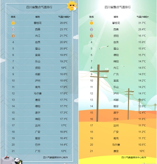 3月23日(左圖)與3月22日(右圖)四川各城市實況氣溫對比。