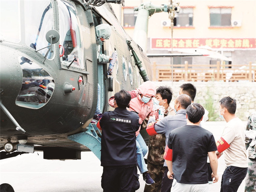 9月7日,首批從海螺溝搭乘直升機(jī)疏散出來的滯留人員抵達(dá)瀘定縣磨西鎮(zhèn)。 新華社 發(fā)