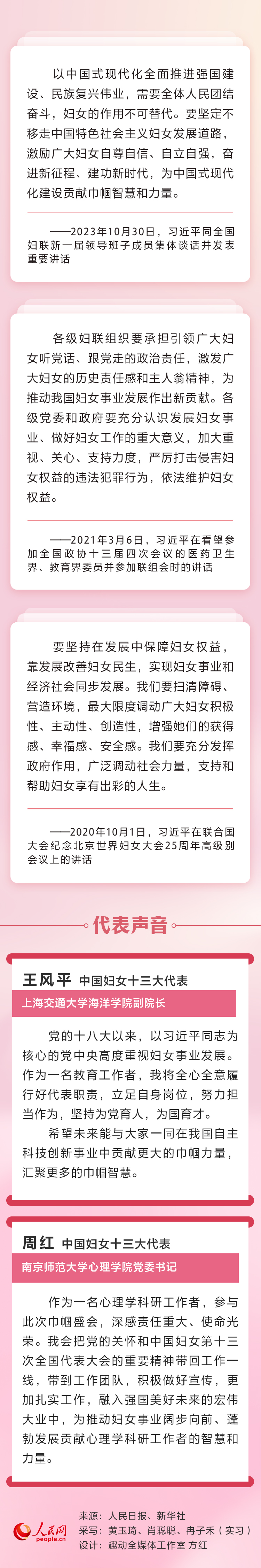黨的十八大以來,以習(xí)近平同志為核心的黨中央從黨和國家事業(yè)發(fā)展全局出發(fā),高度重視和積極推進(jìn)婦女工作,加強黨對婦女工作的領(lǐng)導(dǎo),堅持中國特色社會主義婦女發(fā)展道路,部署婦聯(lián)改革任務(wù),發(fā)揮婦女在各個方面的積極作用,推動我國婦女事業(yè)取得歷史性成就。人民網(wǎng)帶您重溫習(xí)近平總書記重要論述并邀請中國婦女十三大代表解讀。