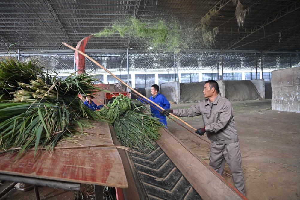 近日,在廣西來(lái)賓市一家養(yǎng)牛場(chǎng),工作人員正將甘蔗尾梢加工成飼料。 新華社記者 周華 攝