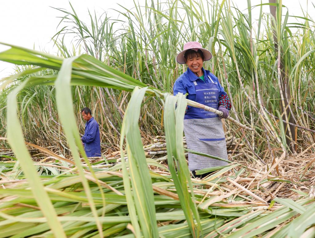 近日,在廣西來(lái)賓市興賓區(qū),蔗農(nóng)正在砍收甘蔗。新華社記者 胡星宇 攝