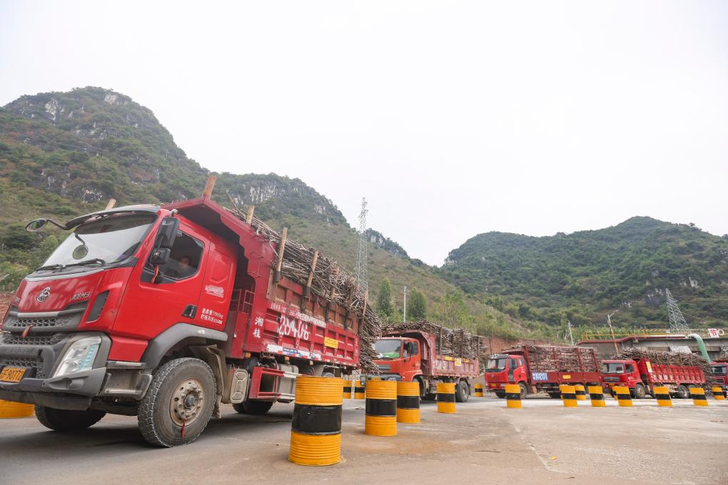 近日,在廣西來(lái)賓市一糖廠,裝滿(mǎn)甘蔗的車(chē)輛正排隊(duì)入廠。新華社記者 胡星宇 攝