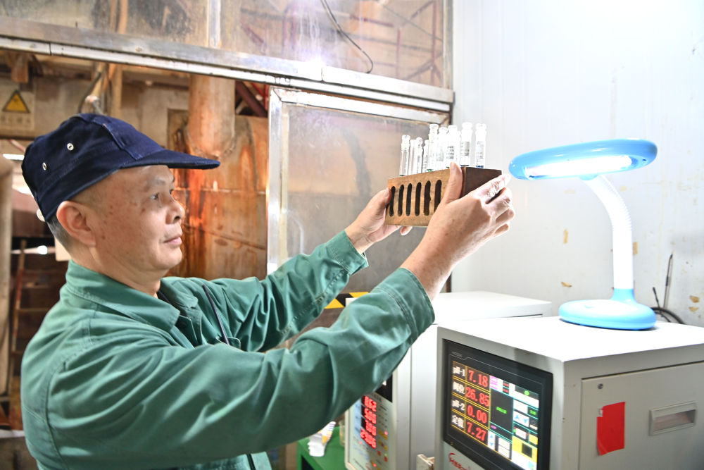 12月12日,廣西來(lái)賓小平陽(yáng)湘桂制糖有限公司的工作人員在檢測(cè)糖漿樣品。