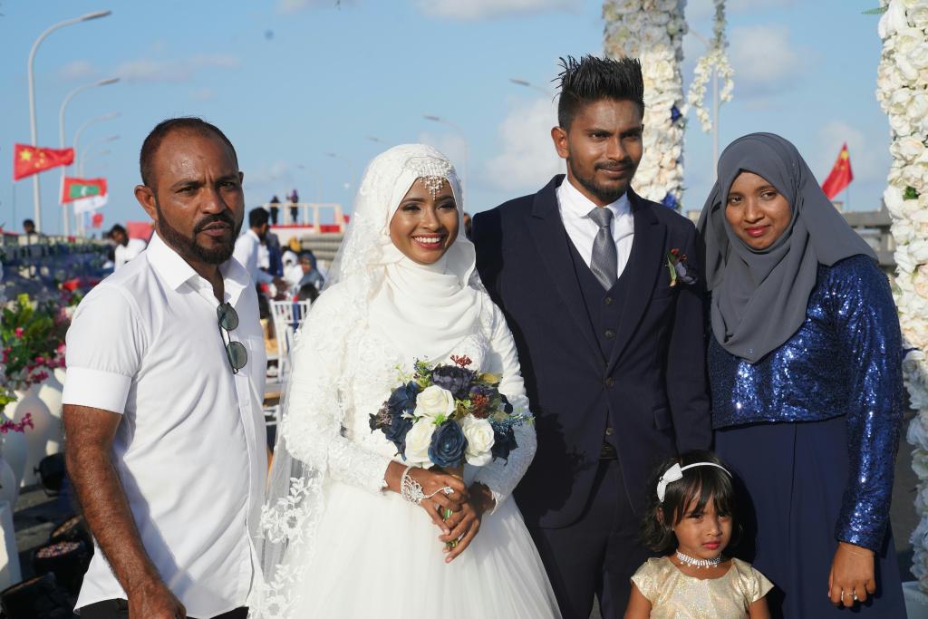 ??2018年8月31日,在剛剛正式通車的中馬友誼大橋上,一對馬爾代夫新婚夫婦與家人合影。