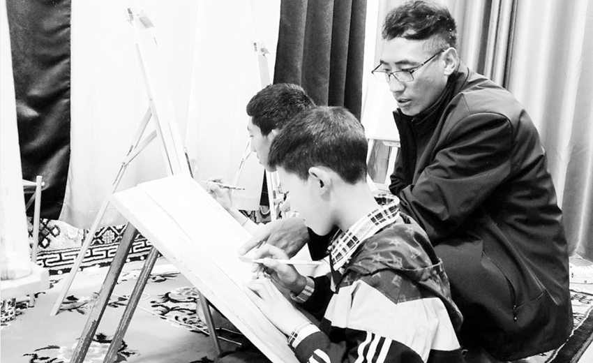 經(jīng)過(guò)一段時(shí)間的調(diào)整和恢復(fù),幾經(jīng)思考,昂旺西繞決定嘗試用左手重拾畫(huà)筆。自學(xué)兩年后,在家人的支持和鼓勵(lì)下,踏上了前往西藏學(xué)習(xí)繪制唐卡的道路。從基礎(chǔ)的線(xiàn)條勾勒到給唐卡上色,5年的學(xué)藝生涯里,他不分晝夜、從早到晚地反復(fù)練習(xí),好在有著多年彩繪的經(jīng)驗(yàn),在唐卡繪畫(huà)的學(xué)習(xí)上一點(diǎn)就通,克服左手畫(huà)畫(huà)的困難后,他很快便順利出師回到家鄉(xiāng)并經(jīng)營(yíng)起繪制唐卡的工作室。