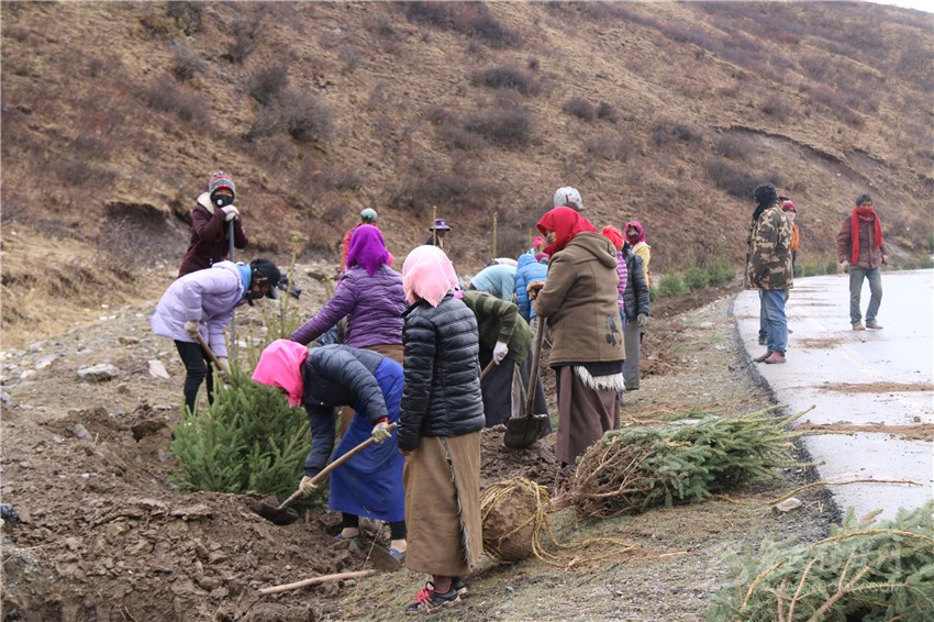 圖為甘孜縣群眾正在國(guó)道317線旁植景觀樹(shù)。