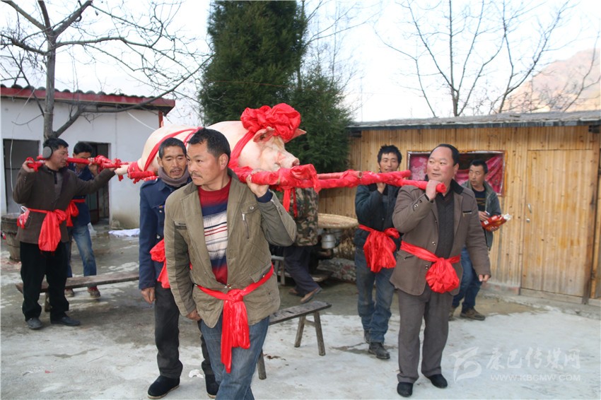 5個(gè)村民將年豬抬到秤上。360斤。村民為年豬準(zhǔn)備大紅花。準(zhǔn)備紙錢(qián)、香蠟。9點(diǎn)整,殺豬匠開(kāi)始了他的工作,在眾人齊心協(xié)力下,光溜溜的年豬被打整干凈?!氨S游覀兇鍋?lái)年風(fēng)調(diào)雨順、五谷豐登,村民平安健康?!贝逯欣险呔催^(guò)天地后,8個(gè)身強(qiáng)力壯的村民站在年豬旁,豎著拇指齊聲說(shuō),今年家家戶戶還要養(yǎng)大肥豬。抬著年豬,村里的中老年人簇?fù)碇?,走在最前面,唱著悅耳的民謠,大意是歌唱幸福生活的,迎著2018年的第一縷陽(yáng)光,村民們喜氣洋洋。到村里來(lái)的游客蜂擁拍照。
