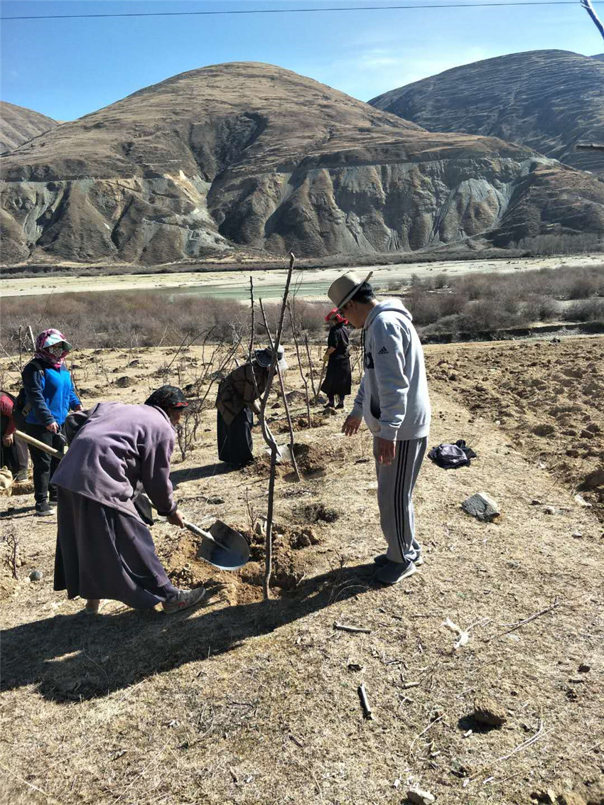 4月,正是高原植樹栽花的好時節(jié),溫暖的陽光把鮮水河兩岸照耀得一片金黃,斯木鎮(zhèn)俄米村的30多位村民在早晨的陽光下熱火朝天地栽著種根徑超過0.05米的5年樹齡、高達(dá)2米的杏樹,有人用鋤頭清坑,有人用鐵鏟培土,有人躬身用臉盆澆水,從青海移栽到爐霍的杏樹,將在明年的今天為爐霍帶來杏花的海洋。