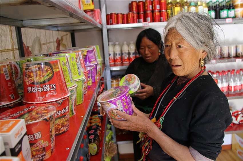 貨架上的貨物琳瑯滿目,價格與縣城大超市一分不差,還節(jié)省了路途奔波?!凹议T口就能買到東西,還又好又便宜,安逸。開展精準扶貧,硬是為大家解決了大困難。” 村民格瑪拉措道出了村民們的感激。大家共同商議決定把這超市叫做“洛蝦村感恩超市”。