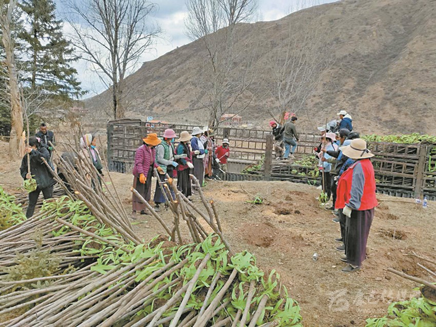 爐霍縣斯木俄米脫貧攻堅(jiān)造林專合社組織村民下苗,準(zhǔn)備栽種。 爐霍縣林草局 供圖