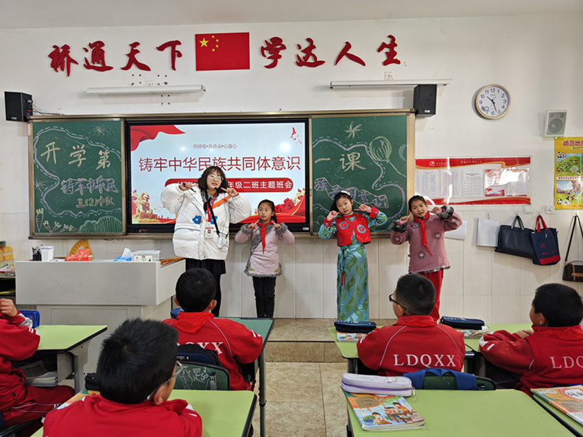 “同學(xué)們,新學(xué)期新起點(diǎn),沐浴著紅城綠谷春的氣息,我們定要同努力、共奮進(jìn),健康成長,揚(yáng)眉‘兔’氣!”典禮一結(jié)束,學(xué)生回到教室后,各班班主任便結(jié)合班級(jí)情況,開展以“鑄牢中華民族共同體意識(shí)”為主題的“開學(xué)第一課”班會(huì)活動(dòng)。