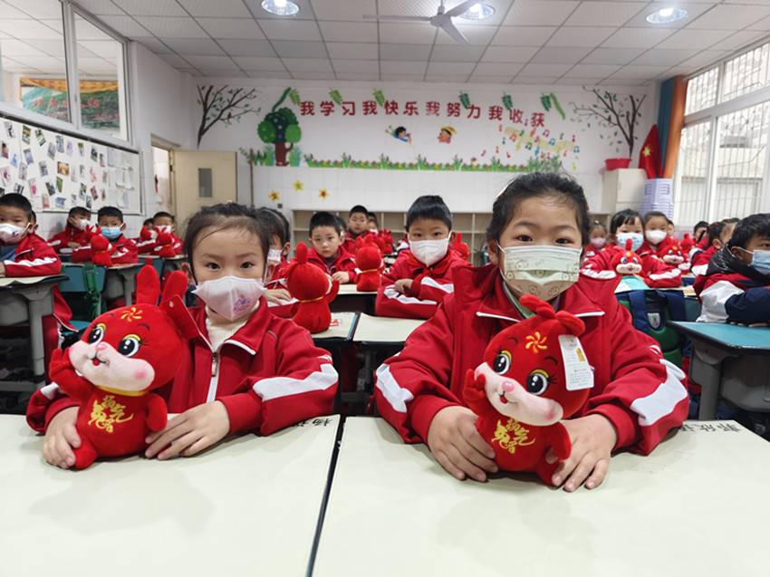 記者注意到,整個(gè)校園及各班教室都布置了精美的迎新文化墻,上面張貼懸掛著學(xué)生們?cè)诤偕钪兄谱鞯闹黝}創(chuàng)意海報(bào)。教室內(nèi),每張課桌上不僅插著寫滿祝福語的彩色氣球,還擺放著用紅絲帶打包好的新課本或一套精美文具或一只兔子玩偶,亦或是棒棒糖、旺仔牛奶等零食,均寓意新學(xué)期大吉大利、越來越棒、大展鴻“兔”、“兔”飛猛進(jìn)。“這些別出心裁的小禮物,能給孩子們留下一個(gè)美好的記憶點(diǎn),在給學(xué)生們帶來驚喜的同時(shí),也送上一份最美、最真摯的新學(xué)期祝福!”教師黃宇虹說。