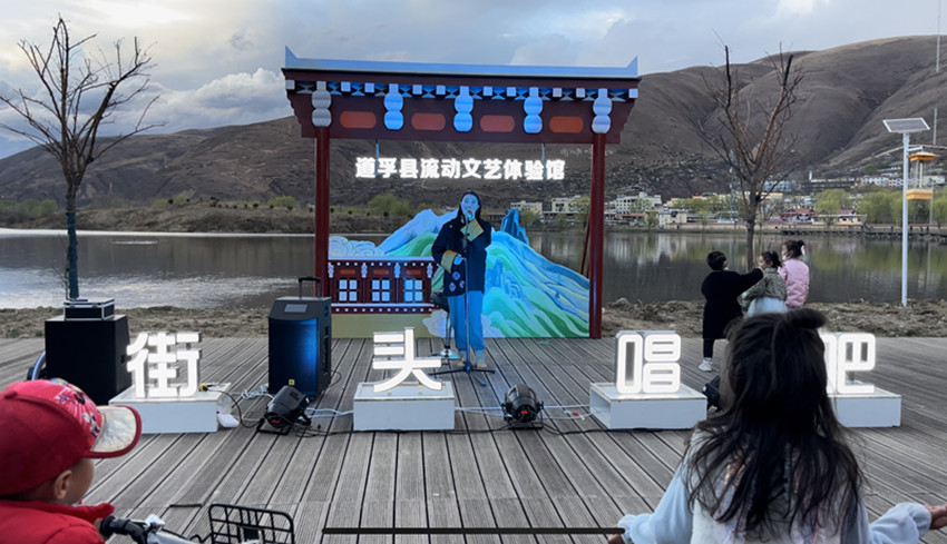 “童心向黨做棟梁,我們小小少年郎美好明天共展望……”稚嫩的歌唱聲從道孚縣濕地公園傳來,跟隨童聲看過去,懸掛著“道孚縣流動文藝體驗館”字樣燈牌,以道孚縣特色民居創(chuàng)意為舞臺背景,擺放著“街頭唱吧”字樣燈牌的舞臺上,一個小女孩站在人群前面舉著話筒聲情并茂的演唱著《童心向黨》。