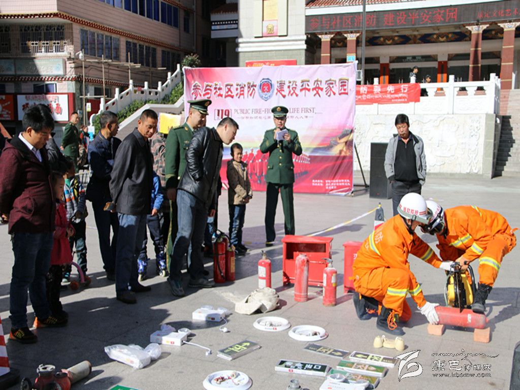 在“119”到來之際,為提高群眾消防安全意識(shí),積極查找身邊火災(zāi)隱患,州公安消防支隊(duì)于8日在康定情歌廣場(chǎng)開展“參與社區(qū)消防、建設(shè)平安家園”消防宣傳主題活動(dòng)。活動(dòng)現(xiàn)場(chǎng)除展示了消防器材、消防車輛及宣傳品外,還開展了油盆滅火、銷毀過期消防產(chǎn)品等活動(dòng)。為提高群眾參與度,本次宣傳活動(dòng)還采取消防知識(shí)有獎(jiǎng)趣味問答、關(guān)注微信抽獎(jiǎng)等方式進(jìn)行互動(dòng)。圖為消防官兵向向群眾展示消防器材。