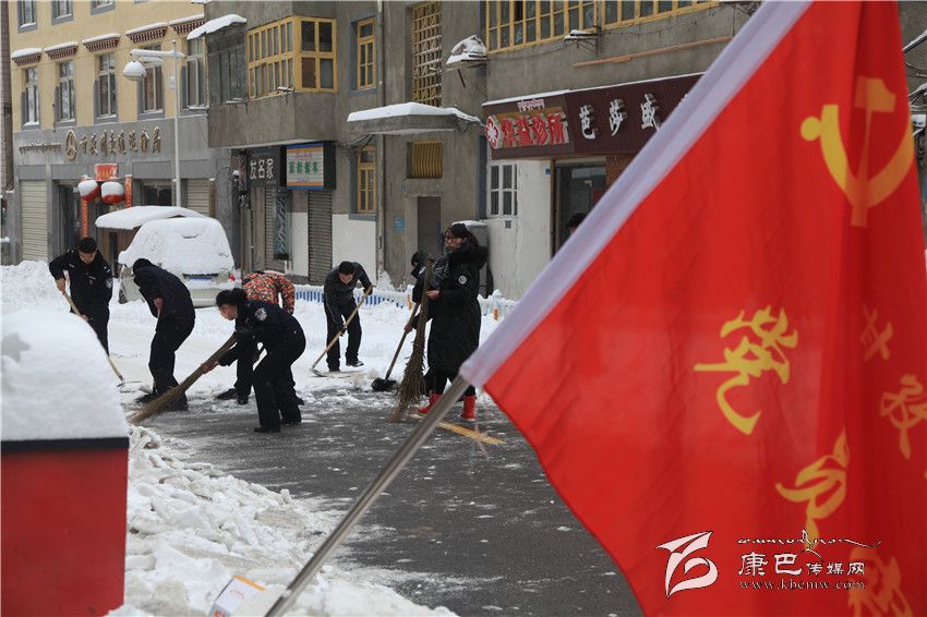 一陣鐵鏟的撞擊聲把記者吸引到了州公安局辦公大樓附近,大雪中,一面寫(xiě)有黨員突擊隊(duì)字樣的紅旗格外引人注目。經(jīng)過(guò)訊問(wèn)記者得知,這支鏟雪隊(duì)是由州公安局的黨員和民警組成的,因?yàn)橥k姡偌又l(fā)現(xiàn)辦公樓外的街道上積雪太厚,給行車(chē)、行人造成了不少麻煩,所以州公安局的黨員、民警組成了這支臨時(shí)突擊隊(duì),分成兩個(gè)小組分頭突擊。在他們身后,已經(jīng)有數(shù)百米街道上的積雪被清除。此外,在將軍橋附近,武警官兵也加入到清理積雪的行列,那道橄欖綠在雪中顯得格外美麗。
