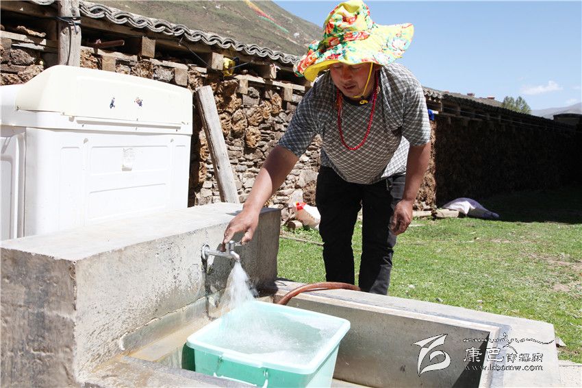 這是一幢位于半山坡上的漂亮藏房,這是一座寬敞干凈的農(nóng)家院落。正在院子里的水龍頭前洗衣服的布窮拉,一面羞紅著臉招呼著我們,一面將洗衣粉撒進洗衣機里,高速運轉的洗衣機不時拋出幾朵洗衣粉泡沫。說起自來水,不善言辭的布窮拉確實感觸尤深:“我家附近只住了4戶人家,根本就沒想過這輩子還能用上自來水。去年鄉(xiāng)上在實施第二批人口安全飲水工程項目時,居然也把我們幾家規(guī)劃進去了。當時,我以為只是說說而已,沒想到20來天后施工隊果真就把水管鋪設到了我家。通水那天,我們幾家人還特意慶祝了一盤。如今,我再也不用每天往返到色曲河背水了,我家的背水塑料桶隨之也就‘下崗’了。”