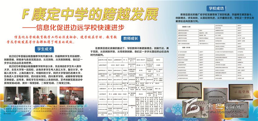 2002年以來康定中學(xué)立足民族地區(qū)教育實(shí)際,依托成都七中優(yōu)質(zhì)教育,先后開通成都七中高中直播班、初中錄播班,建成初中遠(yuǎn)程直錄播教學(xué)AB平臺(tái),實(shí)現(xiàn)了與國內(nèi)名校共享優(yōu)質(zhì)教學(xué)資源的目標(biāo),將網(wǎng)課教學(xué)打造成學(xué)校教育品牌。經(jīng)過近5000名師生員工的不懈努力,2013年來,康定中學(xué)連續(xù)4年高考硬上本科人數(shù)突破200人大關(guān)。先后有8名學(xué)生被北京大學(xué)和清華大學(xué)錄取。中考綜合評(píng)比連續(xù)9年保持全州第一。