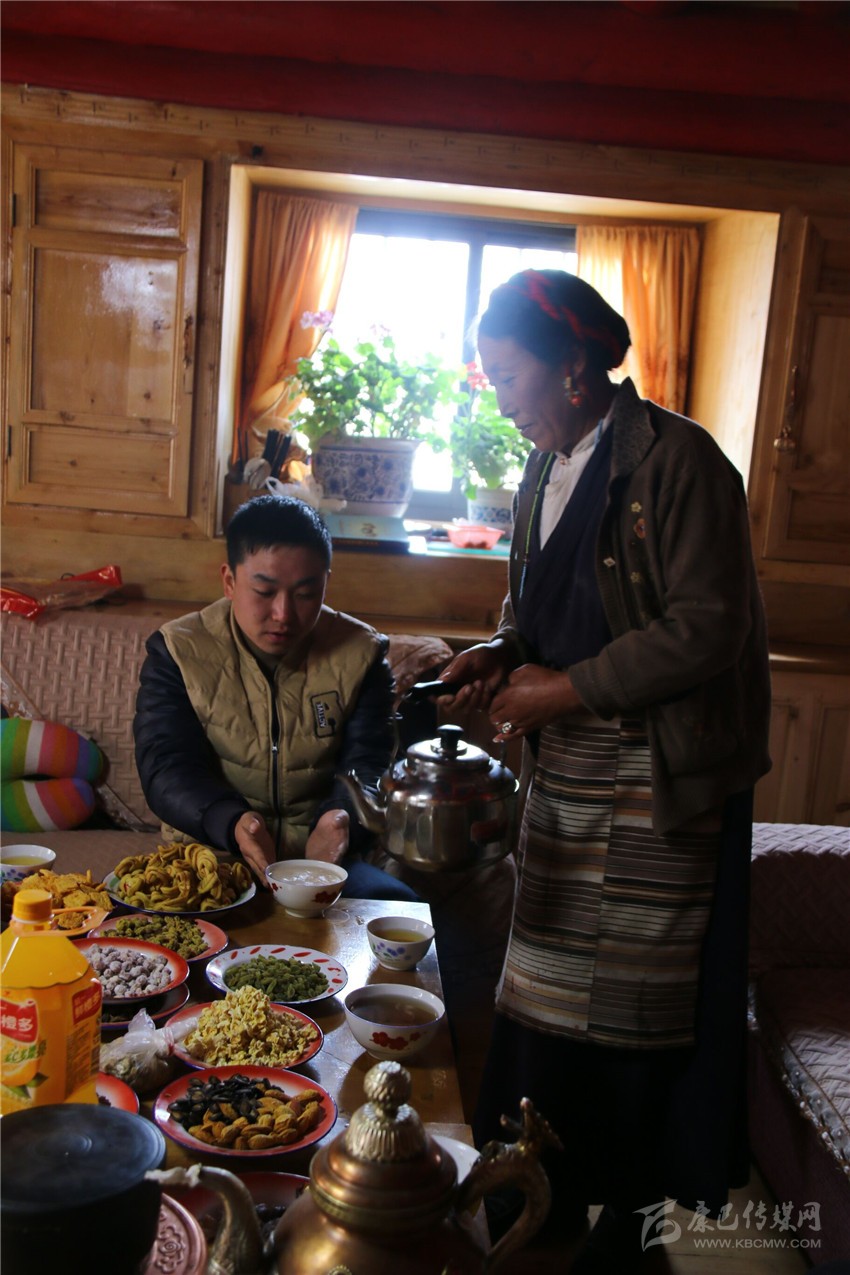 離開合作社,記者一行受邀前往村支部書記澤吉家里做客。汽車在整潔的入戶公路上行駛一陣后,一棟外觀精巧、色彩繽紛的寬大全木質(zhì)民居出現(xiàn)在記者眼前。走進客廳,幾張擺滿了各種水果、飲料、干果、糖、酥油果子的藏桌引起了記者的注意,一位十來歲的女孩正在觀看藏歷新年春晚??吹接锌蜕祥T,澤吉的愛人立刻端來了熱騰騰的酥油茶和黃澄澄的青稞酒。