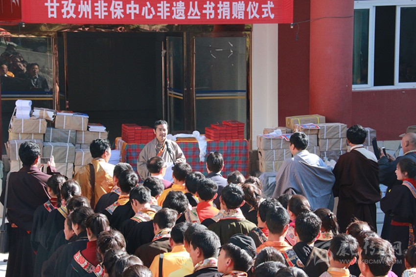 (本網(wǎng)記者 益西貢布 攝影報道)5月13日,州文化館非遺保護(hù)中心非遺叢書捐贈儀式在四川省藏文學(xué)校舉行。此次捐贈的700多冊非遺書籍和畫冊是十多年來州文化館非遺保護(hù)中心通過各種渠道收集、整理、出版的非遺叢書。圖為捐贈儀式現(xiàn)場。