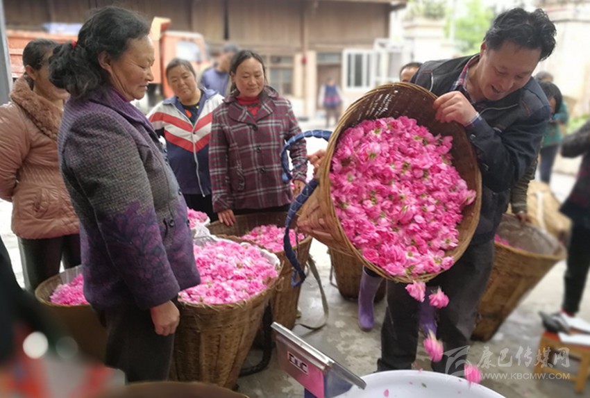 16日上午,小雨停了下來,趕在太陽出來之前采摘的玫瑰花出油率好,是采摘的黃金時間。在燕子溝鎮(zhèn)新龍門子村生產(chǎn)加工點,周邊農(nóng)戶將采摘的粉色玫瑰花瓣過秤,逐筐倒進特定的堆放地點,農(nóng)戶們也收到了應(yīng)得的勞務(wù)收入,空氣中彌漫著一股玫瑰花特有的芳香和浪漫,也充滿了當(dāng)?shù)匕傩招腋:吞鹈鄣奈兜馈?/span>