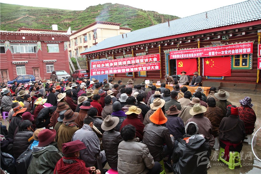 上午10時30分,宣講在濛濛細雨中開始了。只見村民們?nèi)纪χ毖鼦U端坐在雨中,一雙雙渴望的眼睛聚焦在宣講臺上;宣講員松吉尼瑪用生動的例子、經(jīng)典的藏族諺語講述了黨的政策和省第十一次黨代會精神,生動感人的宣講讓現(xiàn)場400余名村民、寺廟僧尼和各級干部滿意的笑聲瞬間蓋過了打著持久戰(zhàn)的雨聲。
