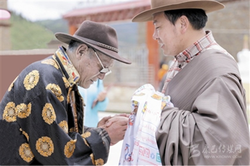 群眾為宣講員獻(xiàn)上潔白的哈達(dá)。