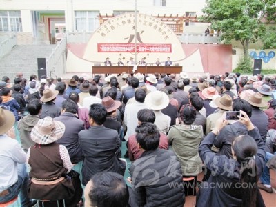 在雅江縣河口鎮(zhèn)希望小學(xué)的廣場(chǎng)上,來(lái)自全鎮(zhèn)各村的430名群眾齊集一堂,認(rèn)真聆聽(tīng)宣講團(tuán)成員其美貢布和劉美翁姆的宣講。