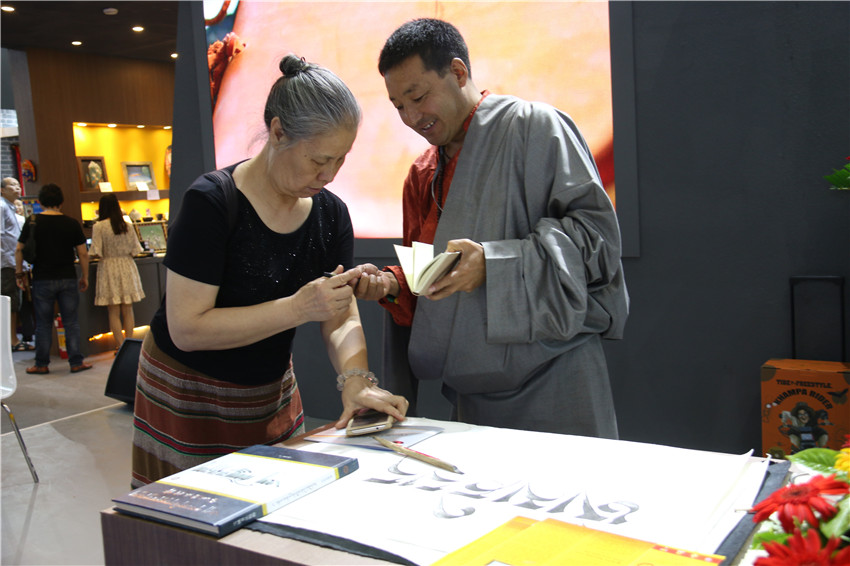 而在同一地點(diǎn)的另一側(cè),省級(jí)藏文書(shū)法傳承人巴松鄧珠的藏文書(shū)法也吸引著眾多愛(ài)好書(shū)法市民前來(lái)觀賞,還有的與他合影?!爸笇?dǎo)過(guò)我的書(shū)法家非常多,他們不僅給了我許多寶貴的意見(jiàn),更重要的是給了我信心和動(dòng)力,讓我堅(jiān)持寫(xiě)書(shū)法,并成為康體藏文書(shū)法的傳承人?!卑退舌囍檎f(shuō),這次能夠得到州委、州政府搭建的平臺(tái),我會(huì)珍惜好這次難得的機(jī)遇,把作品展示好、宣傳好,讓全國(guó)各地的人們更多地了解我州民族文化。