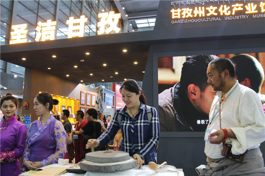 開(kāi)館剛開(kāi)始,我州獨(dú)特文化產(chǎn)業(yè)就吸引各方來(lái)客。在展廳正門(mén)前,德瓊莊園農(nóng)業(yè)文化有限公司扎呷現(xiàn)場(chǎng)演藝磨子推糌粑,他一邊推,一邊說(shuō),糌粑是青稞炒熟后磨成的面,是天然的綠色食品,是藏民族千百年來(lái)的傳統(tǒng)主食之一。這時(shí),很多市民都停住了腳步,品嘗產(chǎn)品的同時(shí),也親手體驗(yàn)這古老的手工磨具。