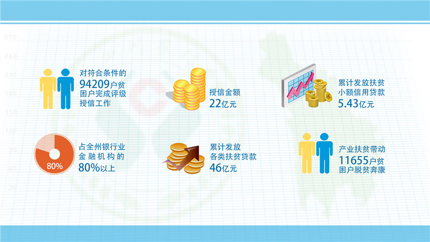 ——強(qiáng)化信貸扶持。緊緊圍繞全州脫貧退出總體目標(biāo),打破各縣劃分片區(qū)、劃分任務(wù)的局面,使脫貧攻堅(jiān)工作從行政手段調(diào)整到市場競爭和民生工程兼顧,堅(jiān)持“三個(gè)一百”——即百分百對(duì)符合條件的建檔立卡貧困戶進(jìn)行評(píng)級(jí)授信,授信面達(dá)到100%;百分百滿足貧困戶有效信貸需求;百分百滿足產(chǎn)業(yè)帶動(dòng)扶貧項(xiàng)目有效信貸需求,加強(qiáng)與18個(gè)縣黨委政府的溝通對(duì)接,瞄準(zhǔn)每個(gè)縣的地方特產(chǎn)產(chǎn)業(yè),因地制宜,為每個(gè)縣量身打造“一縣一策”的金融服務(wù)方案,累計(jì)發(fā)放各類產(chǎn)業(yè)、項(xiàng)目帶動(dòng)扶貧貸款20.69億元。