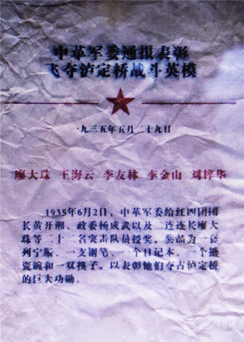 勝利了,對(duì)岸紅旗插上了,飛奪瀘定橋的22位勇士完成了偉大壯舉,為紅軍主力順利渡過瀘定橋創(chuàng)造了條件,寫下了長征途中光輝的一頁。為表彰勇士,激勵(lì)戰(zhàn)士,中革軍委授予了18位勇士飛奪瀘定橋戰(zhàn)斗英模稱號(hào),并發(fā)放了一套列寧服、一支鋼筆、一本日記本、一只搪瓷碗和一雙筷子,以表彰勇士們奪占瀘定橋的巨大功勛。據(jù)父親說,他到延安抗大學(xué)習(xí)時(shí),這只鋼筆每天都陪伴著他,不僅用來寫字,也是對(duì)飛奪瀘定橋戰(zhàn)役的回憶,是他一輩子珍藏的信物。