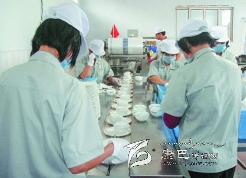 6、包裝。經(jīng)過(guò)消毒后的餐具被送到約2米長(zhǎng)的綠色傳送帶上,工人先用手把餐具按照包裝要求擺放好。之后送到包裝機(jī)器,用包裝膜封口包裝。