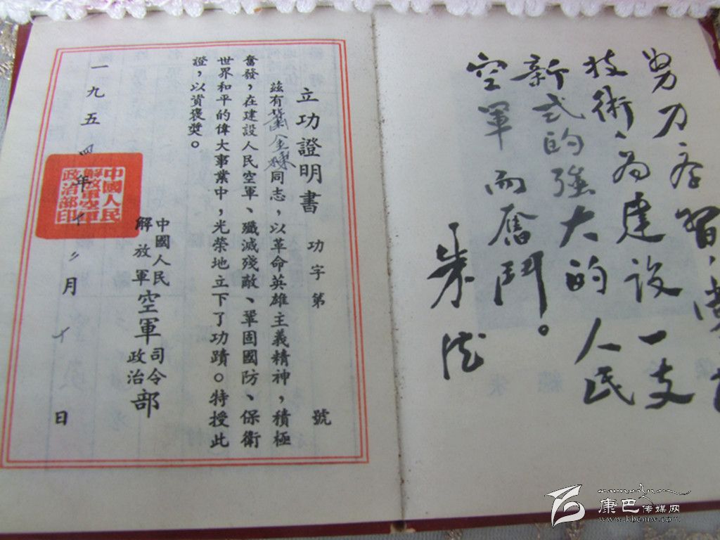 1954年12月10日,該校頒發(fā)的立功證明書上這樣寫道:“茲有肖金棟同志,以革命英雄主義精神,積極奮發(fā),在建設(shè)人民空軍、殲滅殘敵、鞏固國(guó)防、保衛(wèi)世界和平的偉大事業(yè)中,光榮地立下了功績(jī)。”證書上注明為三等功。