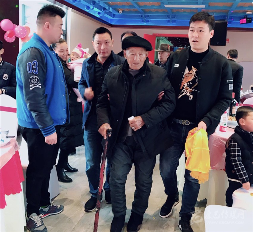 3月5日,在瀘定縣烹壩鄉(xiāng)十里香酒店,按照當(dāng)?shù)貍鹘y(tǒng),王瑞生的兒孫們提前為他隆重過(guò)百歲大壽。雖然已近百歲高齡,但王瑞生精神矍鑠,思路清晰,談吐自如,面色紅潤(rùn)的他身著簡(jiǎn)樸,胸前始終戴著2016年由中共中央、中央軍委頒發(fā)的“中國(guó)工農(nóng)紅軍長(zhǎng)征勝利80周年紀(jì)念章”,接受親友們的祝福。“祝您健康長(zhǎng)壽,開(kāi)開(kāi)心心”。親人們不絕于耳的祝福,老人心滿(mǎn)意足,笑容滿(mǎn)面?!昂茫?,我的家人團(tuán)圓和睦,家庭幸福,是我最大的心愿?!比缃瘢先艘咽撬氖劳?,家人濟(jì)濟(jì)一堂,親情流淌,老人幸福開(kāi)懷。