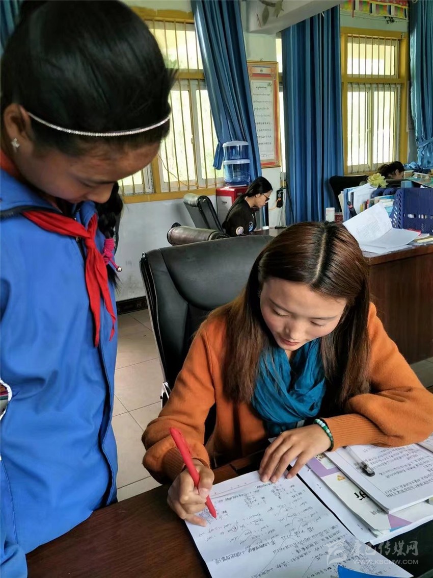 扎西拉姆正在輔導學生的作業(yè)。