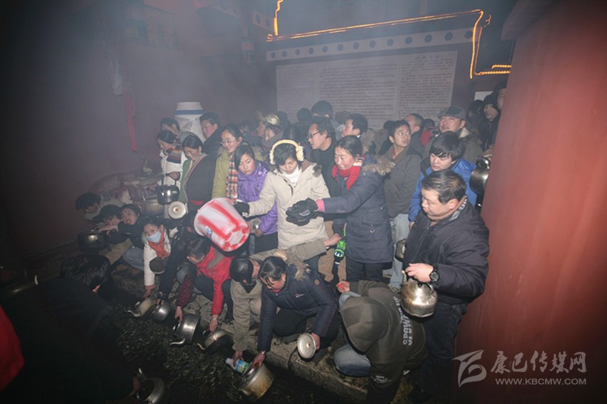 “每年大年三十我都會(huì)在這里來?yè)岊^水,傳說郭達(dá)山神和跑馬山仙女會(huì)化身為一對(duì)金鴨在里面戲水。老人們說大年三十到正月初一‘翻年’那個(gè)節(jié)點(diǎn)來取水,就能看見金鴨,而水也等同于仙液?!痹趧倓偰隄M40歲的陳先生兒時(shí)的記憶中,這里每到春節(jié)“就會(huì)有人提著水桶,拿起茶壺排起長(zhǎng)龍來看金鴨,搶頭水?!?/span>