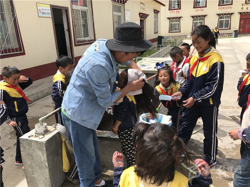 爾金老師給學(xué)生洗頭。