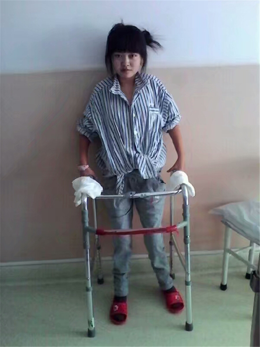 23歲時,深圳的楊先生爽快地幫助朱靈湊夠了手術(shù)費用。2013年9月,朱靈在親人的護送下,到北京接受了手術(shù)治療,手術(shù)很成功。但做牽引、吊腿、揉搓、重壓等康復(fù)訓(xùn)練,如遭酷刑,萬般痛苦,她曾想放棄。在病友和親屬的鼓勵下,她倚墻靠壁,憑借器具,大汗淋漓,通過一個多月的康復(fù)鍛煉,朱靈終于站了起來。