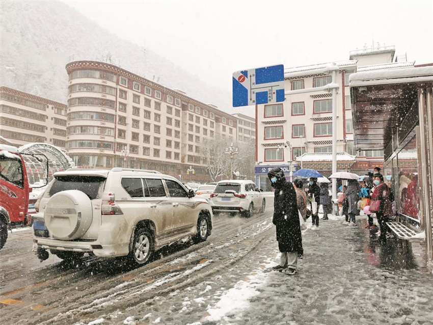 圖為在公交站臺(tái)前冒雪等待公交車(chē)的康定市民。