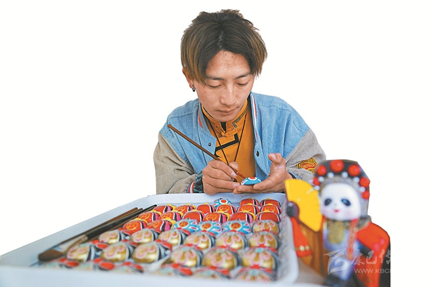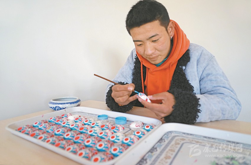 本著自主自愿的原則,教學班結束后,65名藏族青年主動加入扶貧彩繪實訓班,成為項目的第一批學員?!皩嵱柶陂g不需要交任何費用,還包吃住。我對畫京劇臉譜很有興趣,我們第一個月學習繪畫基本功,第二個月開始,根據成品質量,就可以計件得酬勞,學習期間我每月能掙500多元。”邛批說。