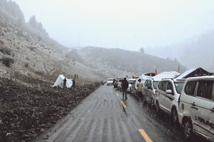 然而,高原的天、娃娃的臉,說變就變。剛剛還艷陽高照的晴好天氣,瞬間寒風四起,鵝毛大雪不一會便覆蓋了整個山野。由于到達蟲草采集點還需4、50分鐘人力轉(zhuǎn)運物資,受天氣影響,前行受阻,擔任護送任務的民輔警當即幫助群眾搭建臨時安置點,風雪中警民互助的身影像極了一家人。一切收拾停當,盡管風寒雪大,條件艱辛,樂觀的群眾和伴隨服務的民輔警還不忘在風雪中來一張合照,他們說,這是歷年來的慣例,每次上山采集蟲草和下山返程,他們都會一個不少地拍張“全家?!?,以此留念蟲草季警民相依的美好記憶。