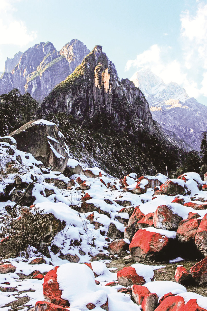 雪山、藍(lán)天白云和黨嶺村的彩林構(gòu)成一幅優(yōu)美的畫(huà)卷。新華社 發(fā)