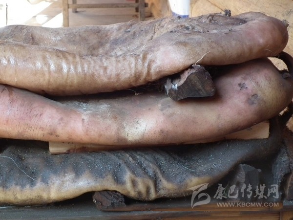 半干豬肉:在丹巴縣革什扎鄉(xiāng)有一種比較奇特的豬肉保存方法:將豬殺死后,不去毛,只在豬的腹部開一條口子取出內(nèi)臟,將血水清理干凈后用麻繩將腹部縫合。隨后用當(dāng)?shù)氐狞S泥漿敷在豬身上,在豬的身上形成一個(gè)厚約2厘米的殼,密不透風(fēng)。處理好后將其懸掛于灶塘之上,使黃泥在高溫的烘烤下快速硬化。如若發(fā)現(xiàn)黃泥層出現(xiàn)裂縫,立即用黃泥漿將其修復(fù)。等到第二年熱天時(shí),敲掉黃泥形成的硬殼,豬毛被輕松退去,豬肉依然比較新鮮。但這種保存新鮮豬肉的方法現(xiàn)在已經(jīng)很少見了,一是因?yàn)檫@種保存方法風(fēng)險(xiǎn)太大,稍有不慎豬肉就可能腐敗;二是如今物資供應(yīng)豐富,新鮮豬肉購(gòu)買方便,使得此種儲(chǔ)存方式失去了存在的價(jià)值。