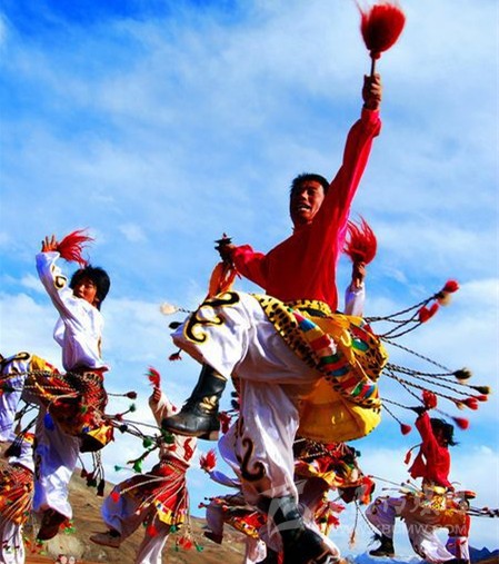 "熱巴"過去是專業(yè)民間藝人賣藝求生的一種技巧和難度很大的舞蹈。熱巴隊的組成一般以家族為核心,或幾家人合作組隊,多者20人,少者4、5人,都是能歌善舞又各懷絕技之人。有弦子(二胡)、鼓、鈴鐺等樂器伴奏。整場演出完整嚴謹,其中戲劇及體育內(nèi)容豐富且有寓意,是一種很有健身作用的民族民間體育舞蹈,其高超的表演技藝和完美的藝術(shù)風(fēng)格享譽國內(nèi)外。